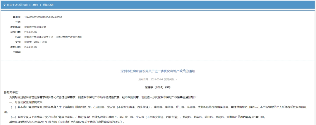 2024年5月6日,深圳市住房和建设局发布《关于进一步优化房地产政策的通知》(以下简称《通知》),从分区优化住房限购政策、调整企事业单位购买商品住房政策、提升二手房交易便利化等方面进一步优化房地产政策。