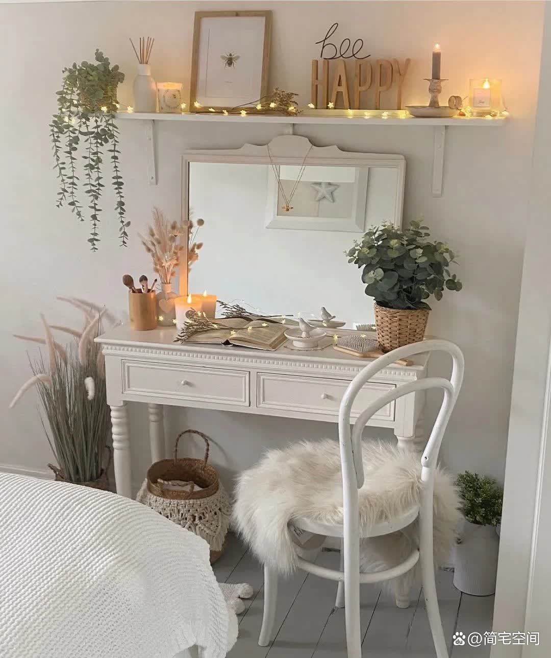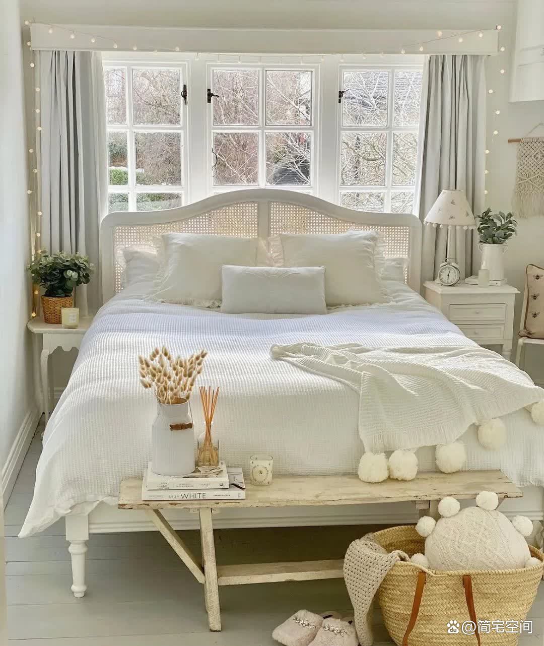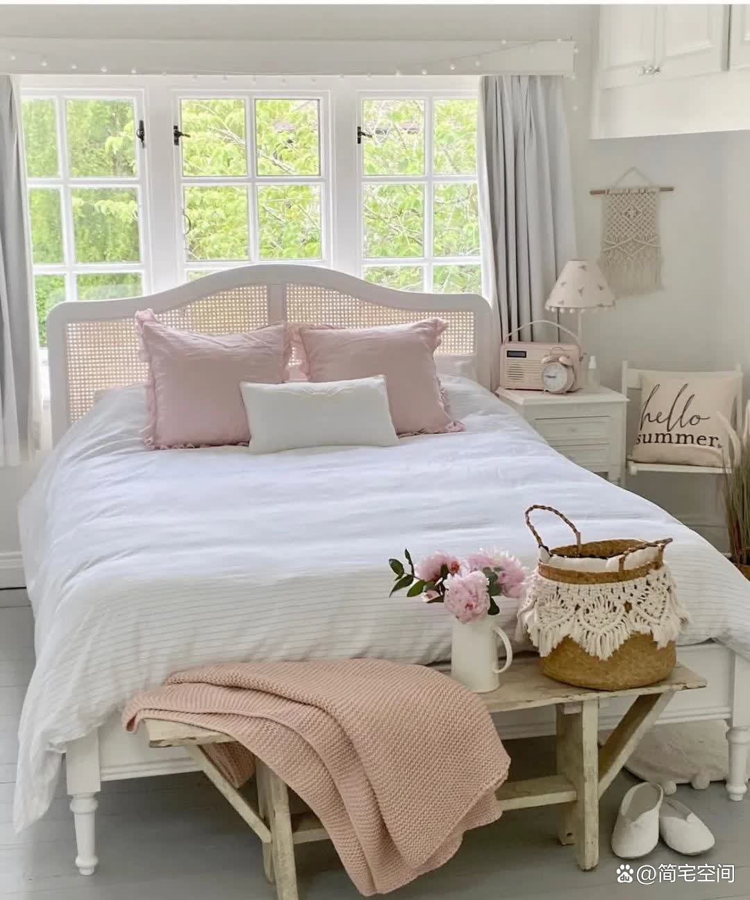 卧室,这个私密的空间,也被装饰得如梦如幻。白色的墙面与灰色的地板形成了柔和的色调,复古风格的白色家具更是增添了几分典雅。藤编的床靠背、精致的小灯饰以及粉色的条纹床品和亚麻靠枕,都仿佛在诉说着一个关于梦与美好的故事。而最让人心动的,莫过于醒来就能看到室内外的樱花景色,那种美感,仿佛能让人忘记一切烦恼,沉醉在这个梦幻的世界中。