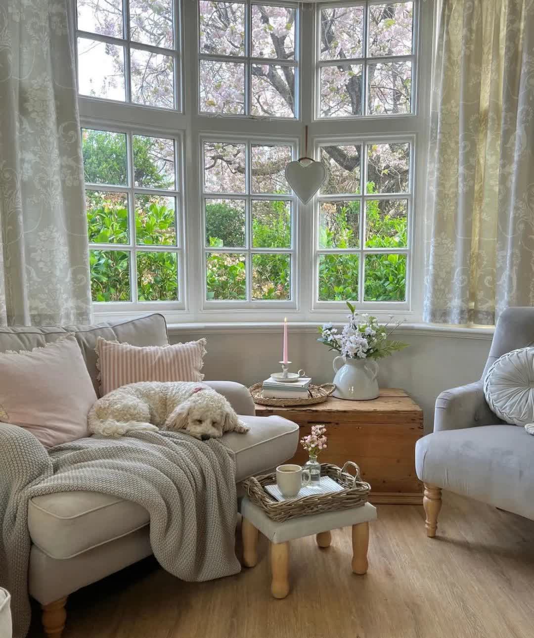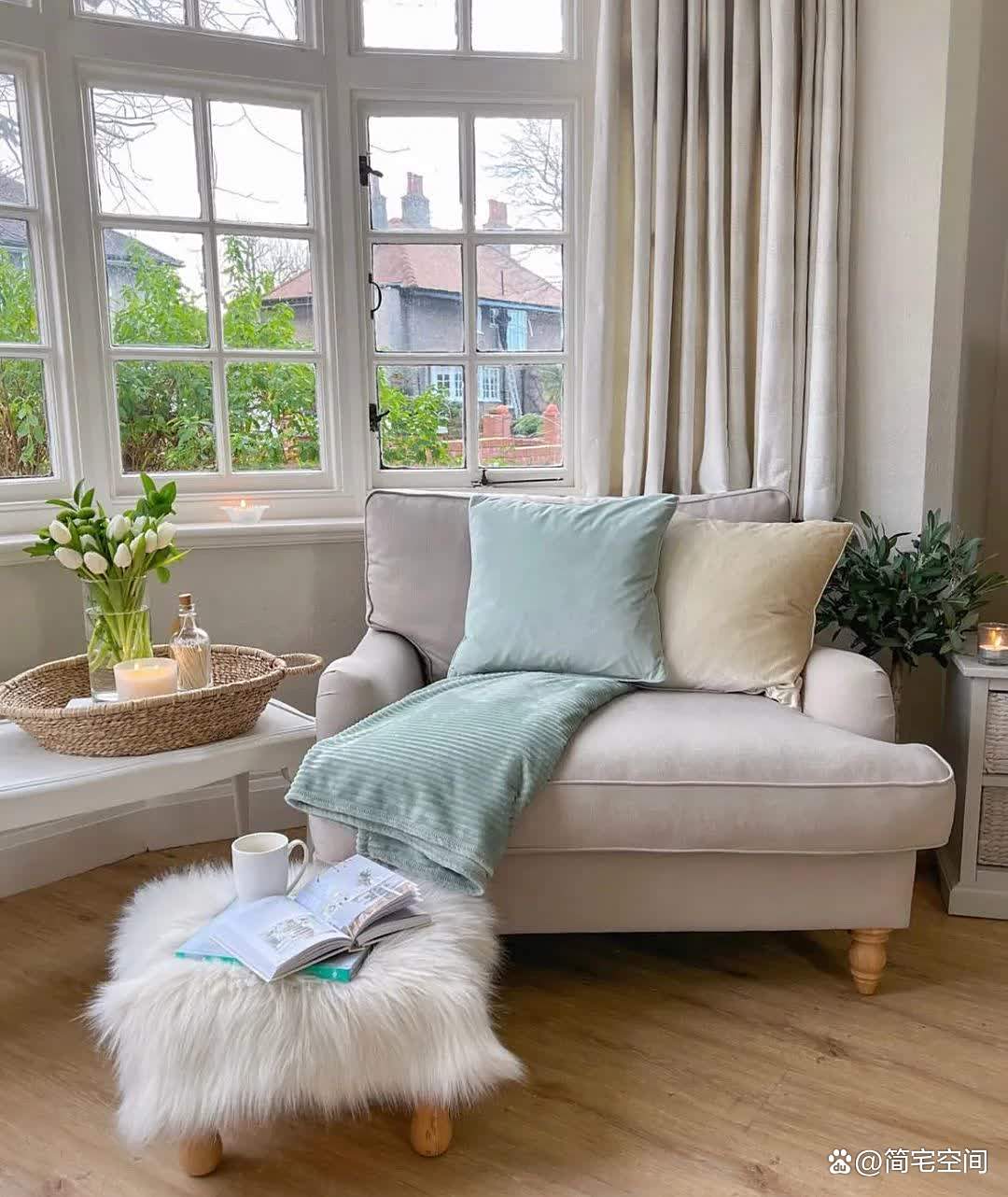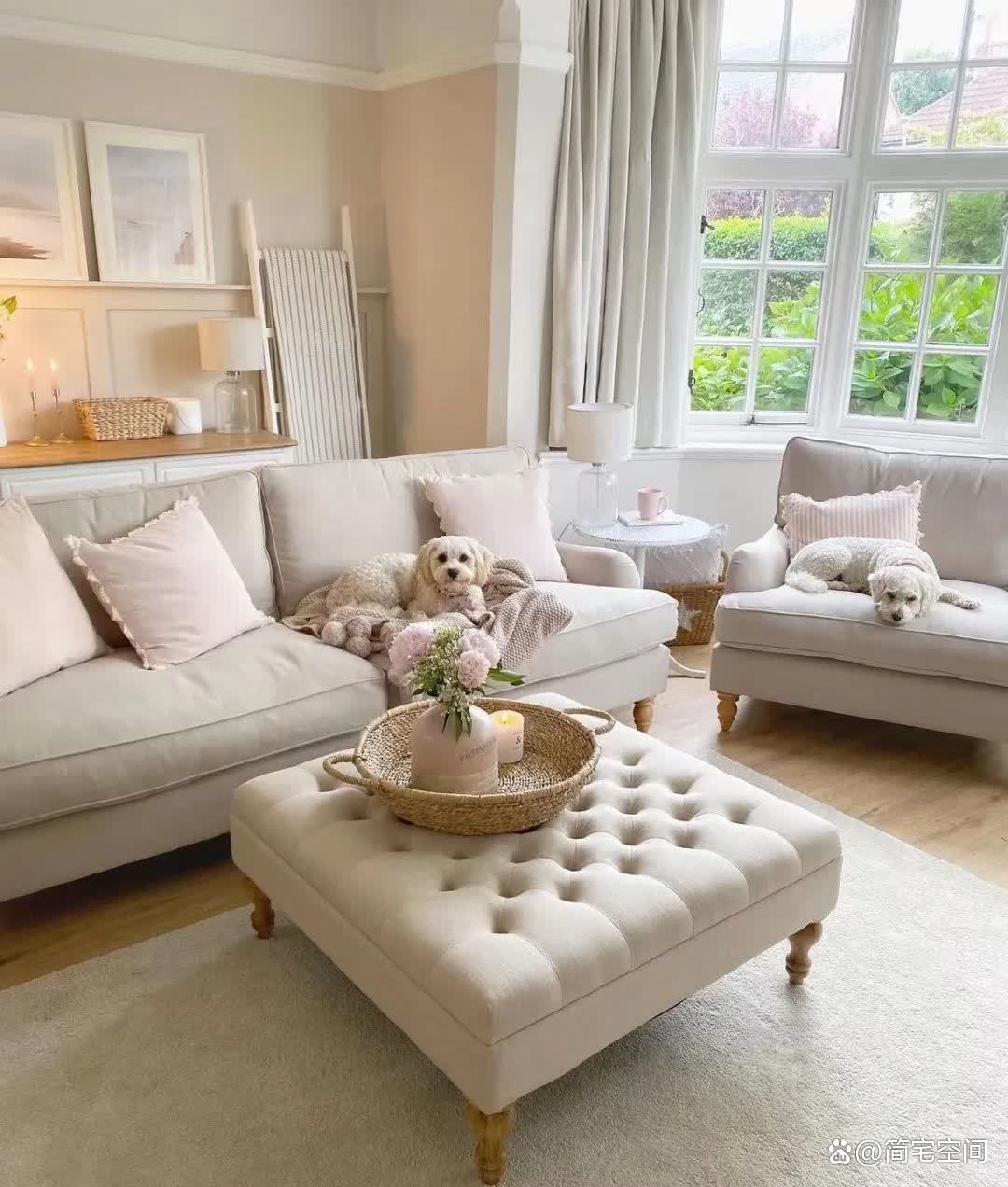 客厅是家的核心,这里以米灰色为主调,搭配粉色的抱枕和清新的花朵,使得整个空间既显得高雅又不失温馨。凸窗的设计,不仅引入了充足的自然光,更巧妙地将院子里的樱花树作为客厅的背景,仿佛是大自然与家居的完美结合。